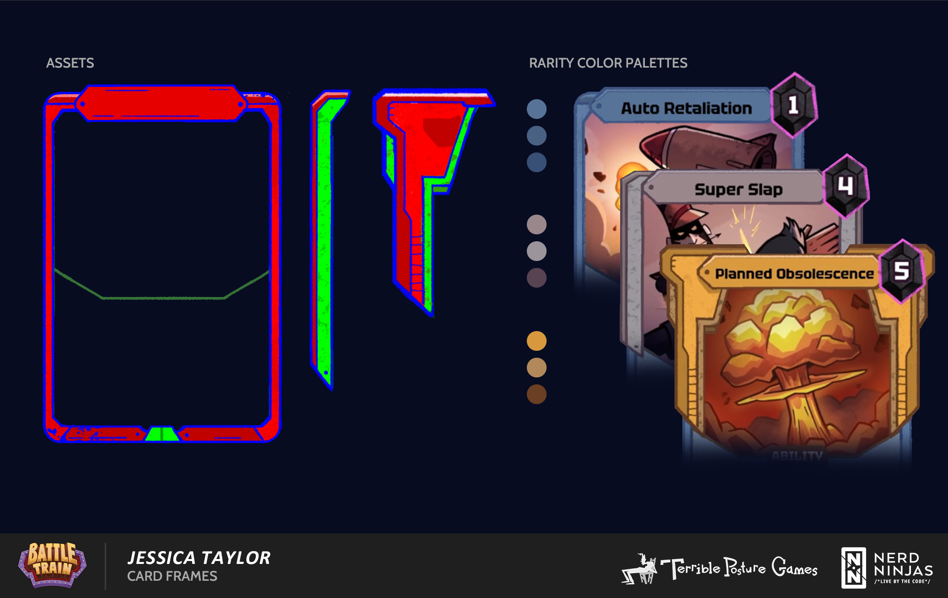 At Terrible Posture Games, I created a set of card artwork for Battle Train, a roguelite deck-builder/rail combat game now available on Steam. Working from concepts by Joe Mirabello, I designed 31 cards representing abilities ranging from healing and mana stims to explosive special attacks.
